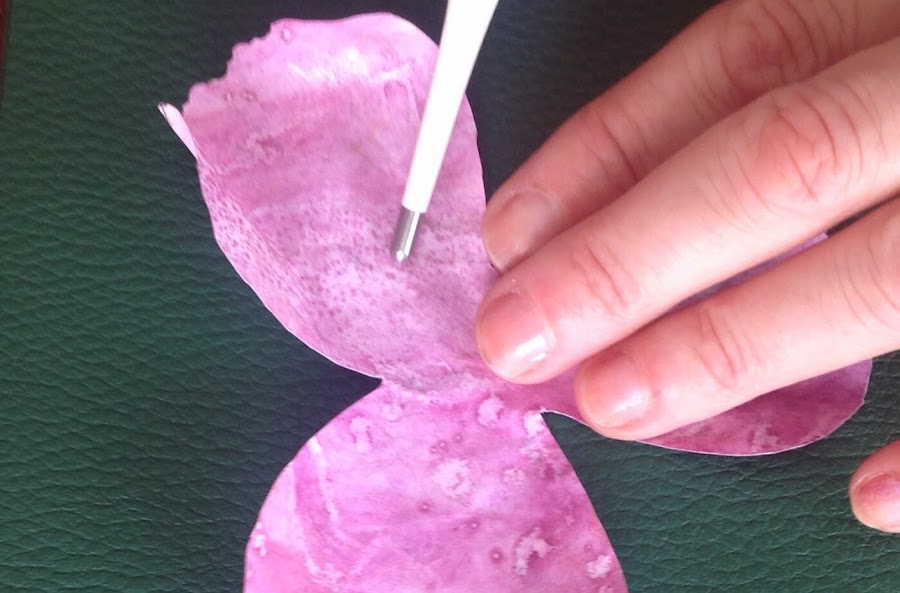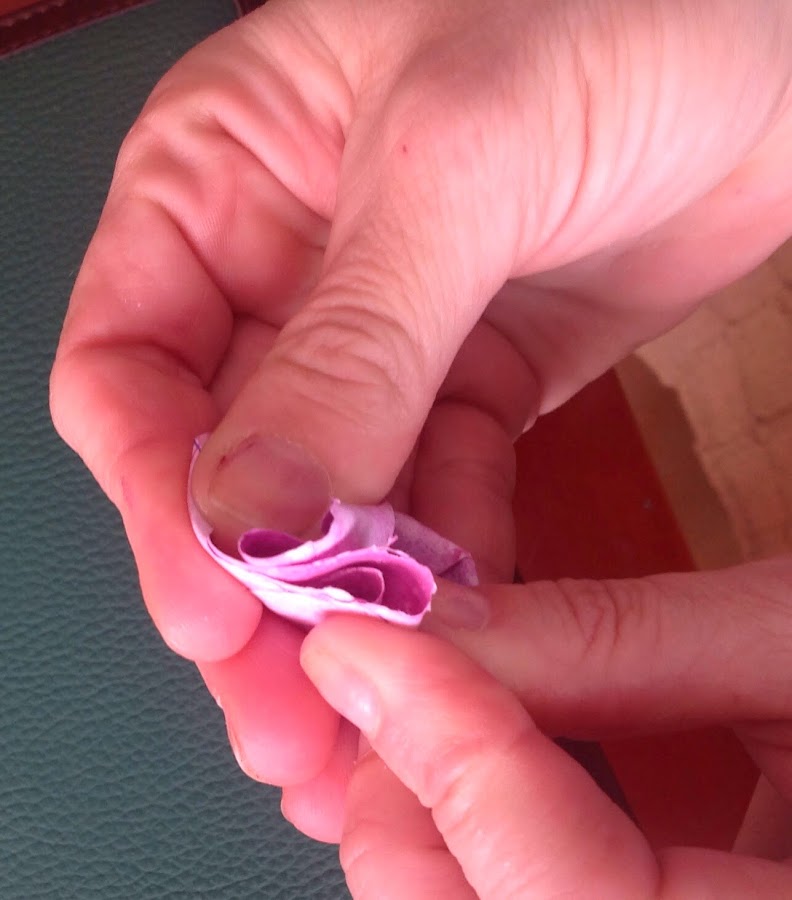 Cuando nos hemos asegurado de dar forma a todos los pétalos...arrugamos el pétalo, bien arrugado, pero con cariño.
