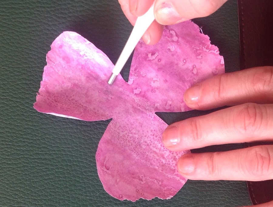 Una vez bien seca, con una punta redonda le damos un poco de volumen, lo ideal, es un buril, pero como no lo tengo a mano, he utilizado la punta de un termómetro digital... Siempre hay un plan B...jeje, soy chica con recursos.