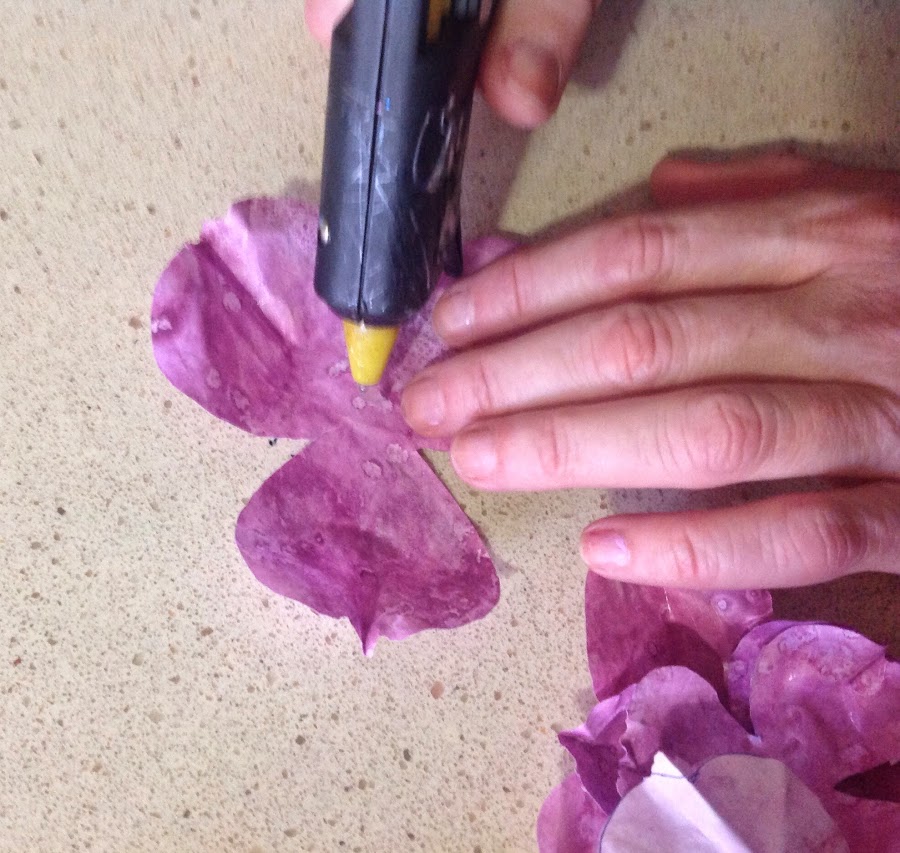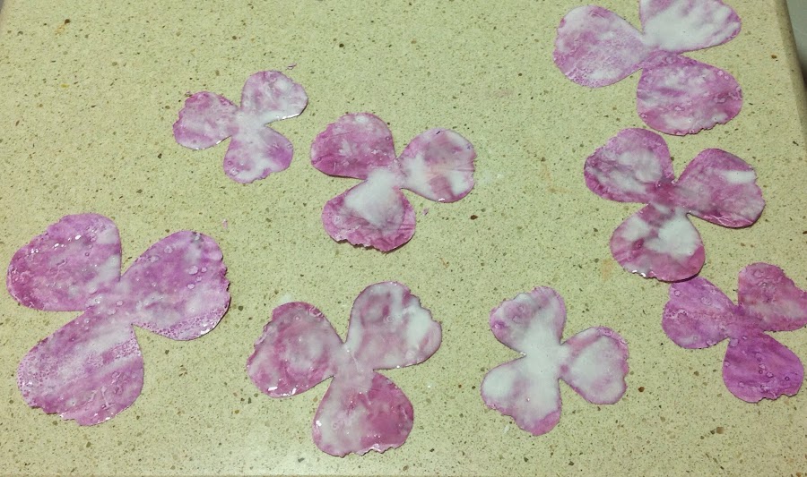 Una vez cortadas las partes de la flor, las impregnamos de cola, esto hará que cojan cuerpo y protegerán a la hora de manipular.