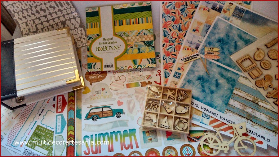 En resto de materiales los tenéis aquí: dos colecciones de Bo Bunny ( Boardwalk y Key Lime) adornos en madera, alfabetos, stickers... también utilizaré papel de acuarela y acetato.