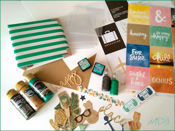 Papel de acuarela, cartulina craft, acrílicas, tintas, diet cuts, perfect pearl, dos papeles (uno de la colección "Intinerary" de Teresa Collins y otro de la colección "Finders Keepers" de American Crafts), las fundas de plástico para el álbum y poco más.