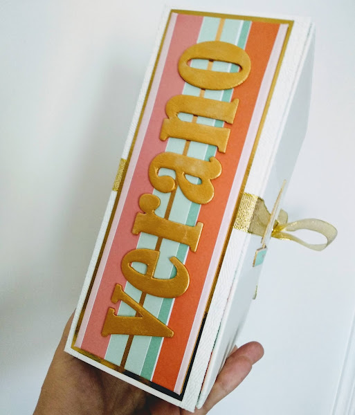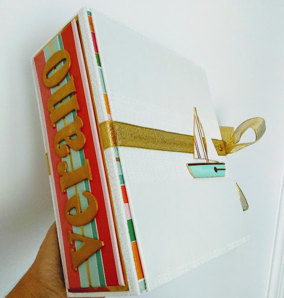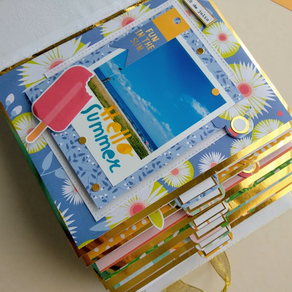 Me decidí por una encuadernación en espina y como base para las páginas usé cartulina metalizada dorada y por la colección Tutti Frutti de My Mind´s Eye que lleva toques también en dorado y me encanta.