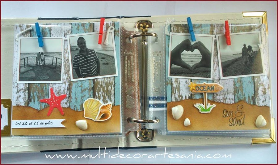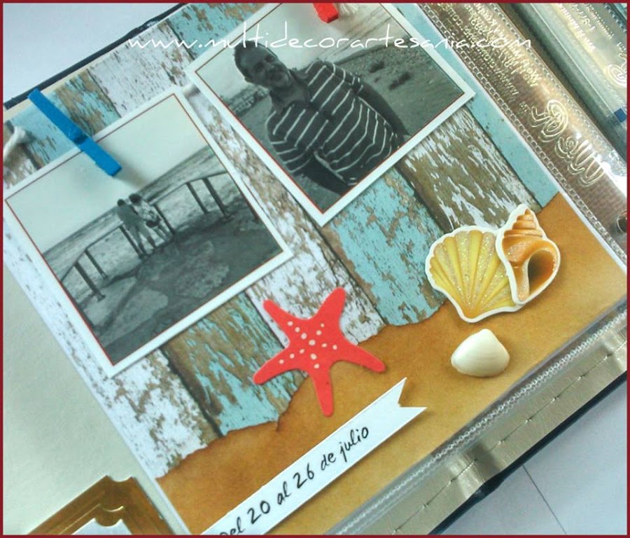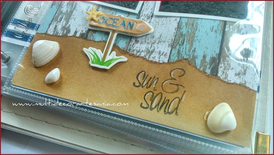 En las dos primeras páginas, fotos de un bonito día de paseo en cuya decoración he incluido pequeñas conchas recogidas esa tarde, un bonito papel de la colección de Bo Bunny que imita madera desgastada y otro en tono arena entintado.