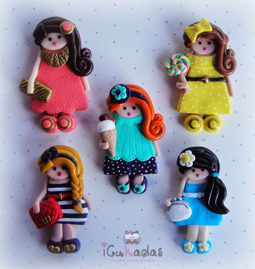 ¿Con cual os quedáis? yo no soy capaz de decidirme, cada una tiene su encanto, y los colores me chiflan. Ah y se me olvidaba, en principio son broches de fimo, pero luego se pueden hacer como imanes, pasarlas a alguna camiseta etc, y por supuesto las Cukas siempre se pueden personalizar.