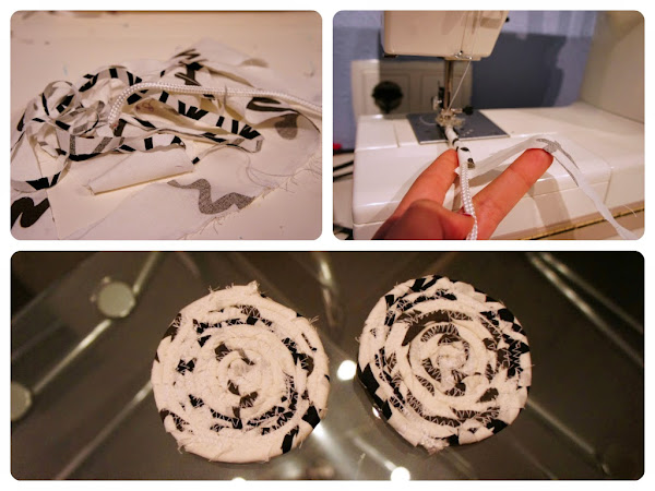 A parte de los restos de la tela sólo necesitas un trozo de cuerda, enrollar la tela alrededor de esta y comenzar a coser en espiral. ¡Y ya está! ^^