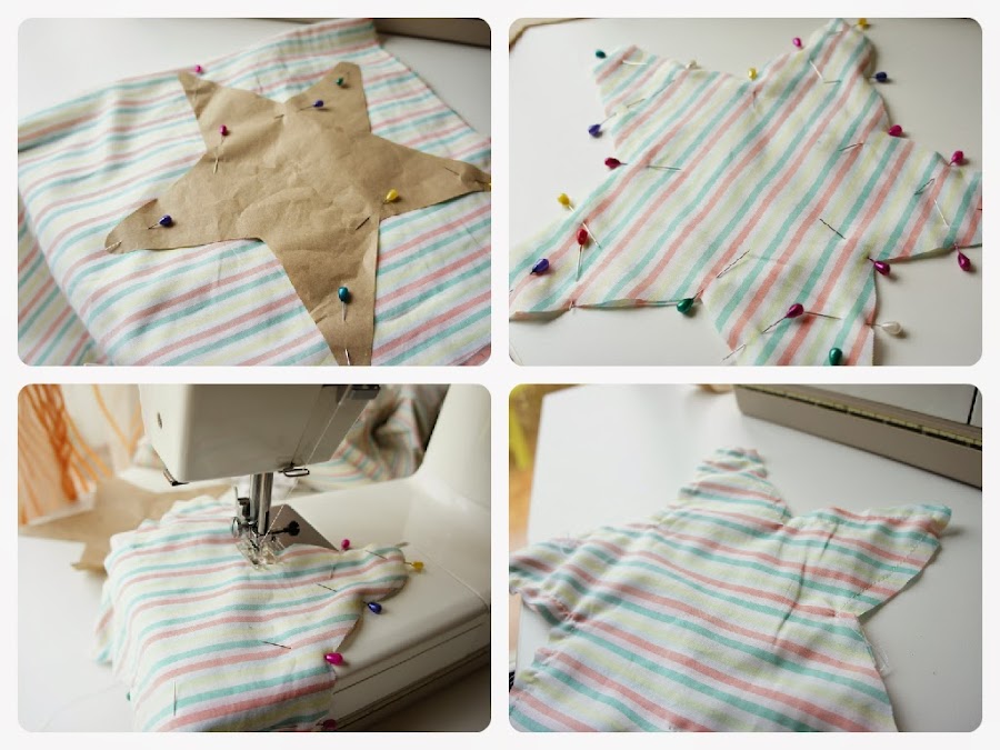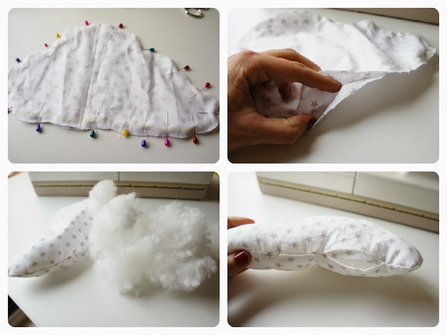 2) Encara la tela y sujétala bien con alfileres (también podéis hilvanar), cóselo teniendo en cuenta que hay que dejar un trozo abierto para poder darle la vuelta y meterle el relleno. Cerramos el hueco cosiendo a mano con puntada invisible.