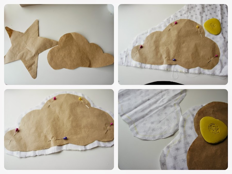 1) Lo primero siempre es dibujar el patrón. Busca trazar siempre formas sencillas para que sea más fácil de coser. Una vez que lo tenemos, lo ponemos sobre la tela y lo sujetamos con alfileres. Calcamos el patrón en la tela y dejamos 1cm alrededor para hacer las costuras.