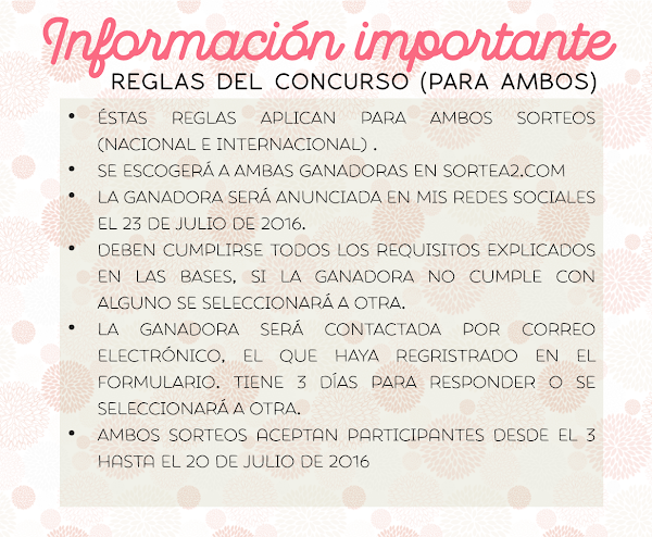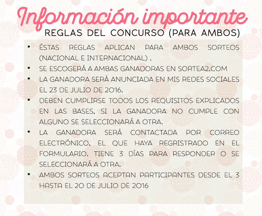 *Voy a anunciar el nombre de la ganadora en mi Facebook, Twitter e Instagram el sábado 23 de Julio de 2016.