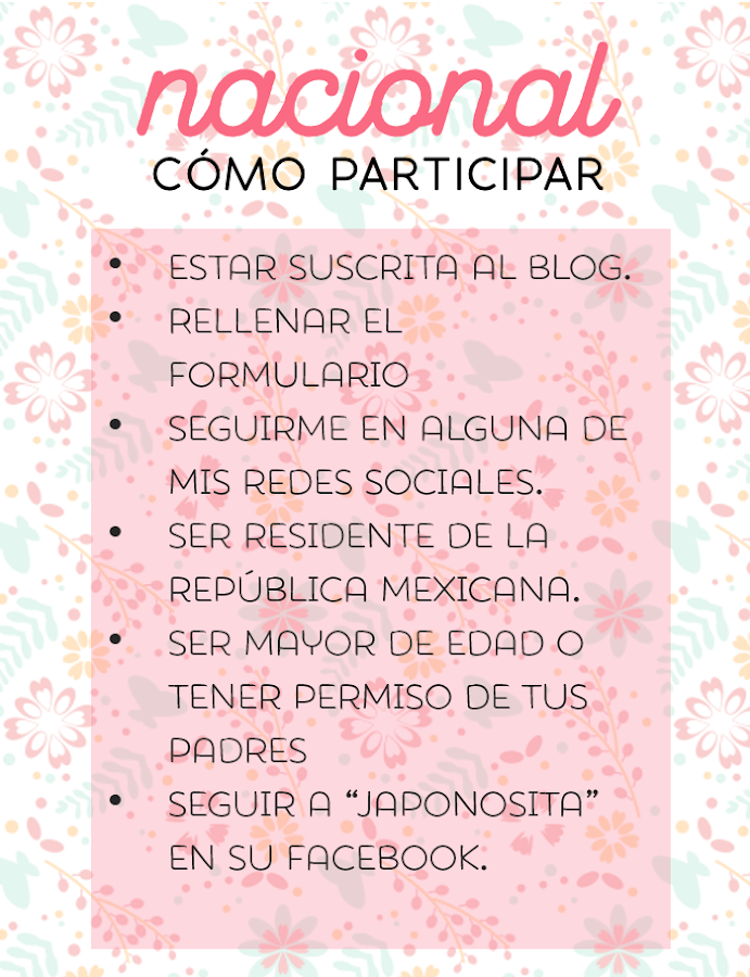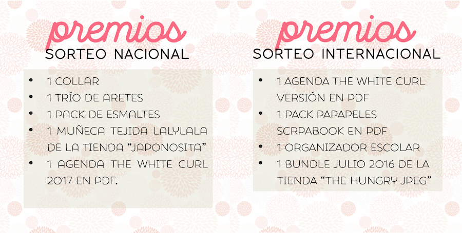 Se trata de dos sorteos, sí, dos; uno nacional (para la república mexicana) en el que le enviaré a 1 ganadora un pequeño paquetito con premios físicos y uno internacional (todo el mundo) en el que le enviaré a 1 ganadora por medio de correo electrónico un paquetito con premios digitales., no quería dejar atrás a las personas de otros países porque también han apoyado mucho a este pequeño blog.