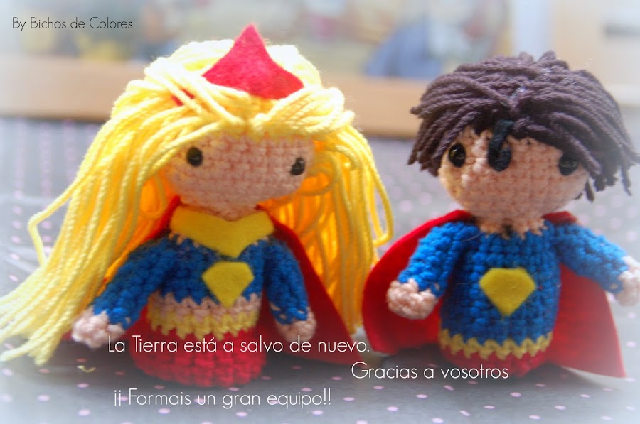 Hoy es 27 de julio, eso quiere decir, que tenemos entre manos el reto super héroes....pero, me puse a pensar....y ¿ porque super héroes y no super heroínas?, así que me decidí por hacer una supermegaheroína...Supergirl!!! Una supergirl de Amigurumi, con mucho pelo....y con detallitos en fieltro. Aunque también quería enseñaros a su colegui, Superman, que juntos forman un gran equipo!!! ¿ que os parecen? son divers ehhh? Ahora para ver más super héroes o super heroínas solo tenéis que pasaros por aquí.