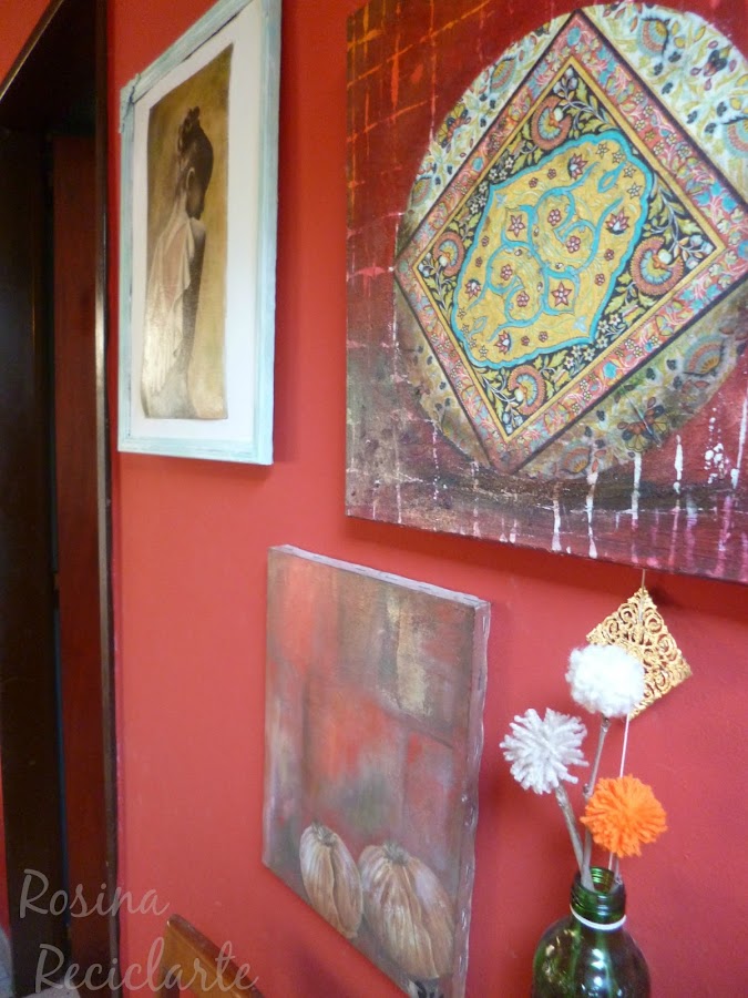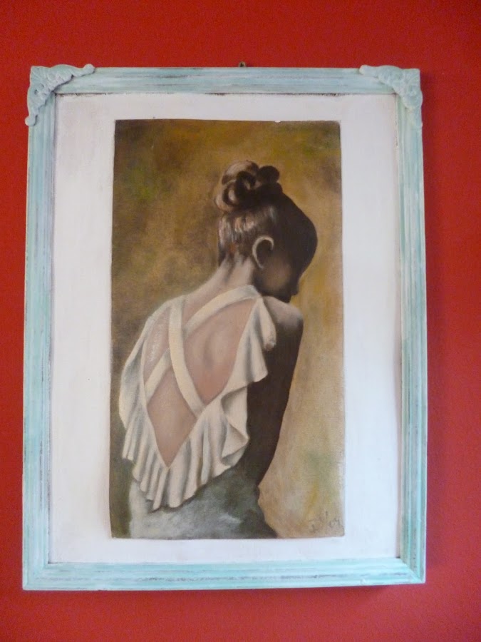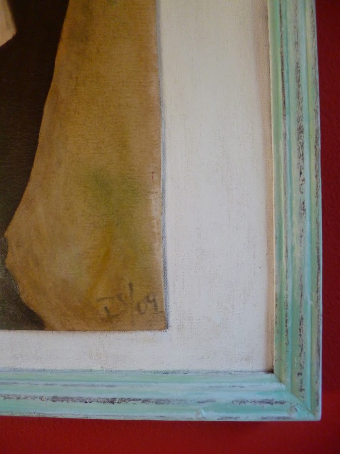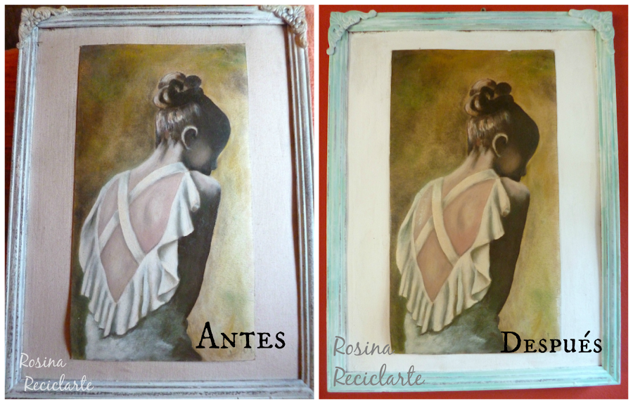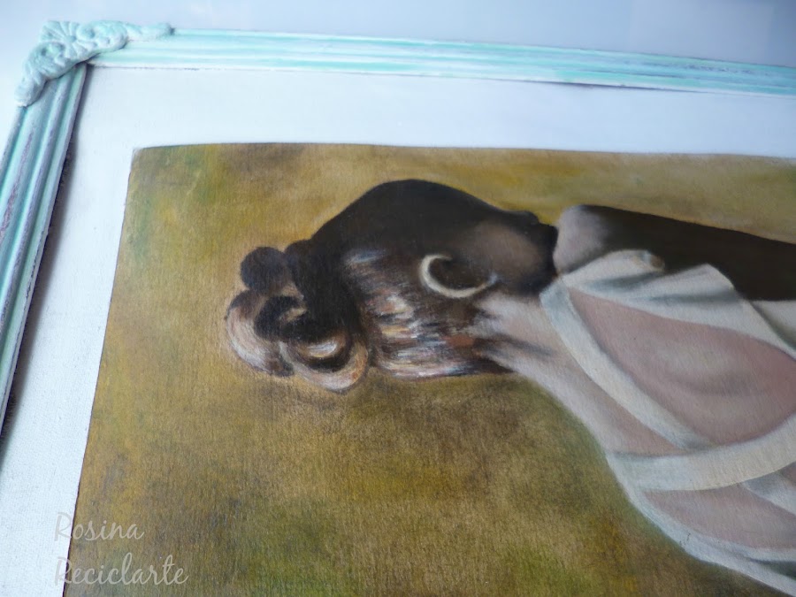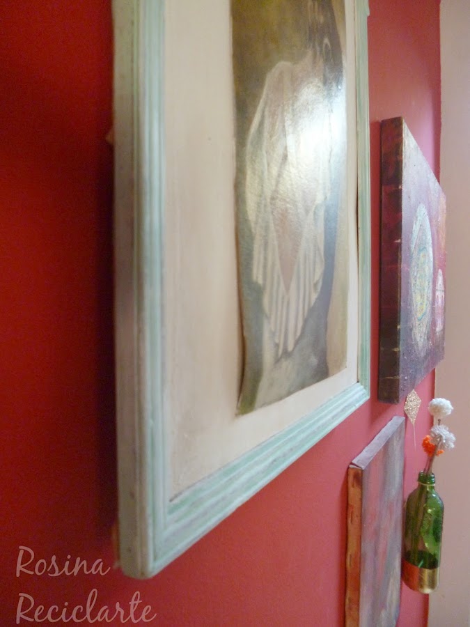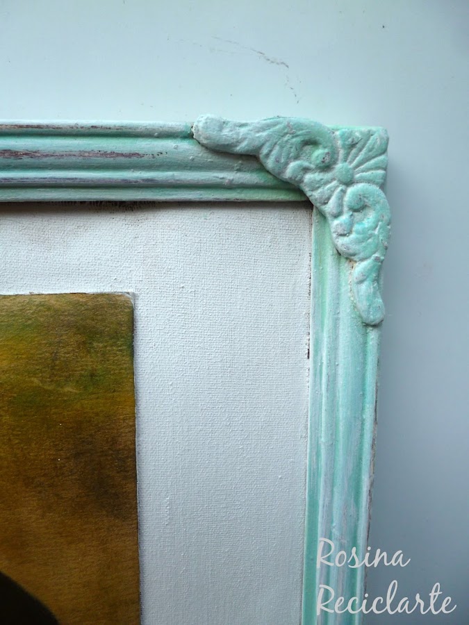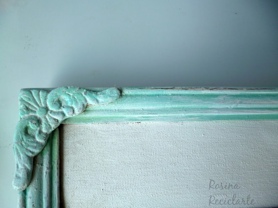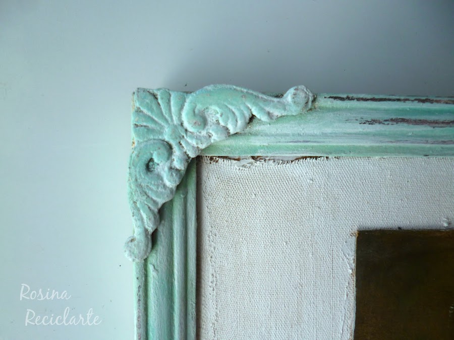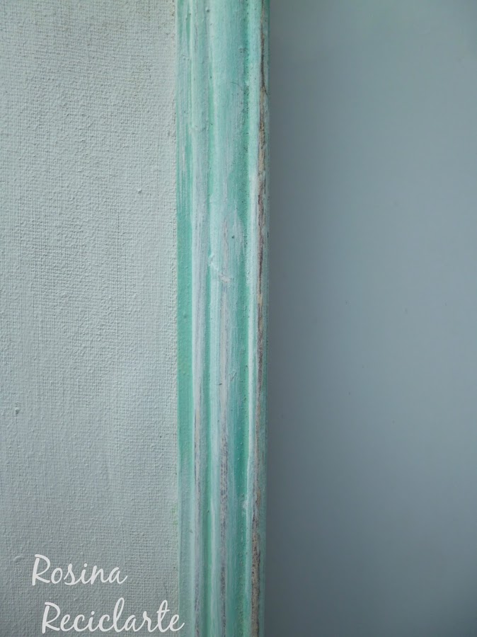 Necesitaba cambiarle el tono,pero un verde-verde desmerecía la belleza de este marco antiguo, entonces solo le di pinceladas de un verde aturquesado(blanco-pin de verde-pin de turquesa)