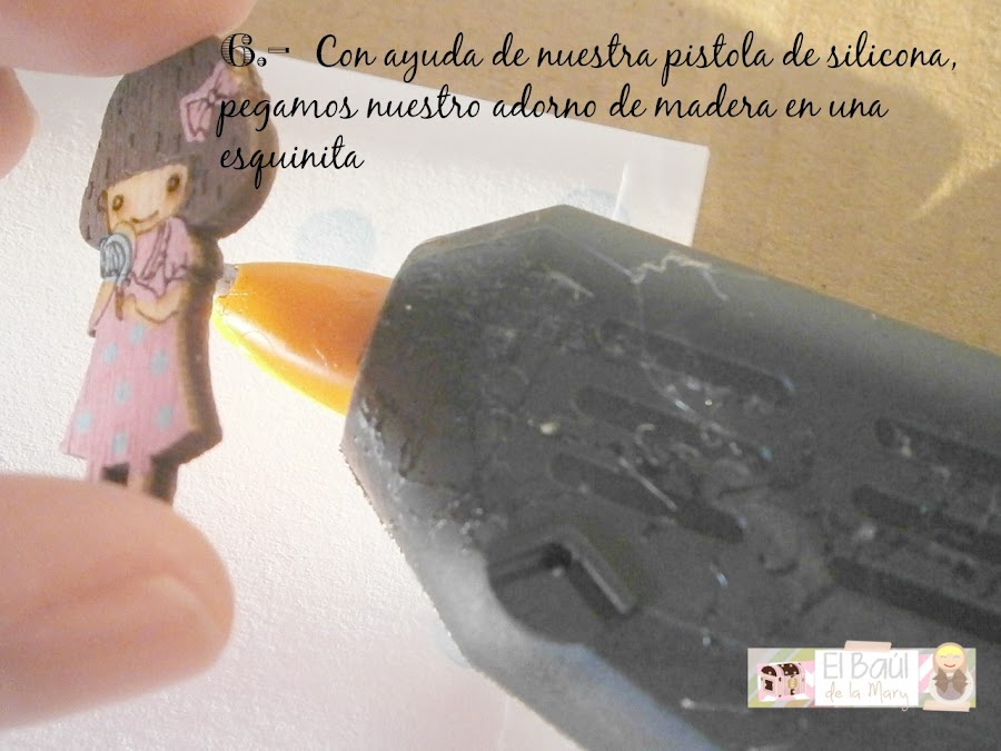 Para terminar de ponerlo bonito, le pegamos un adorno de madera que vaya con nuestro estampado...