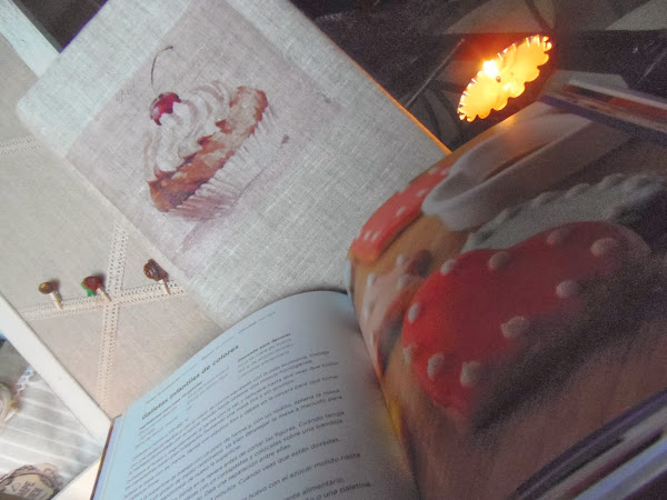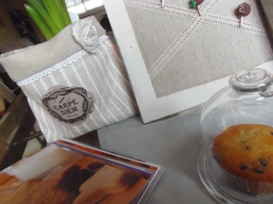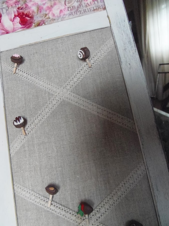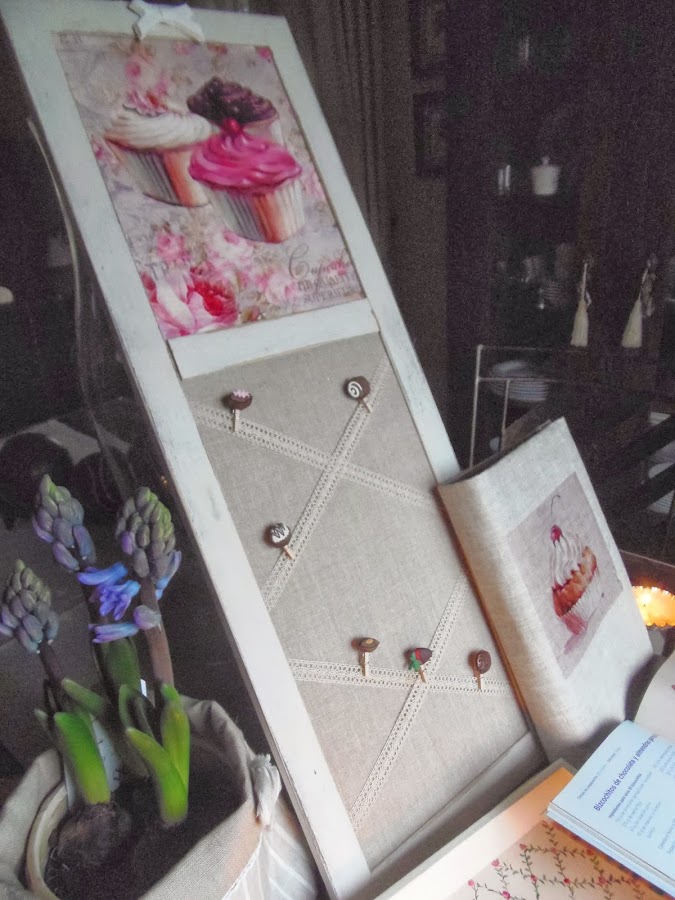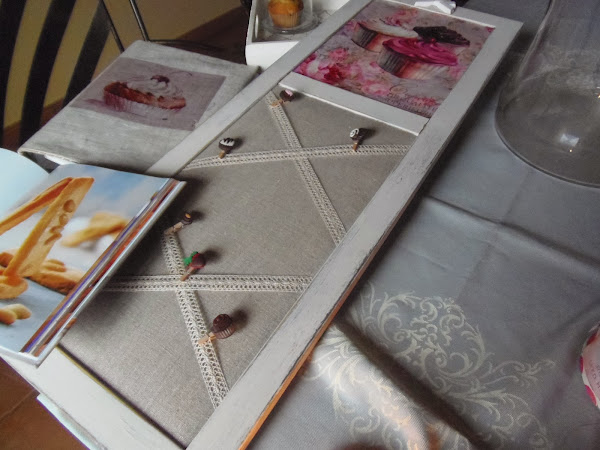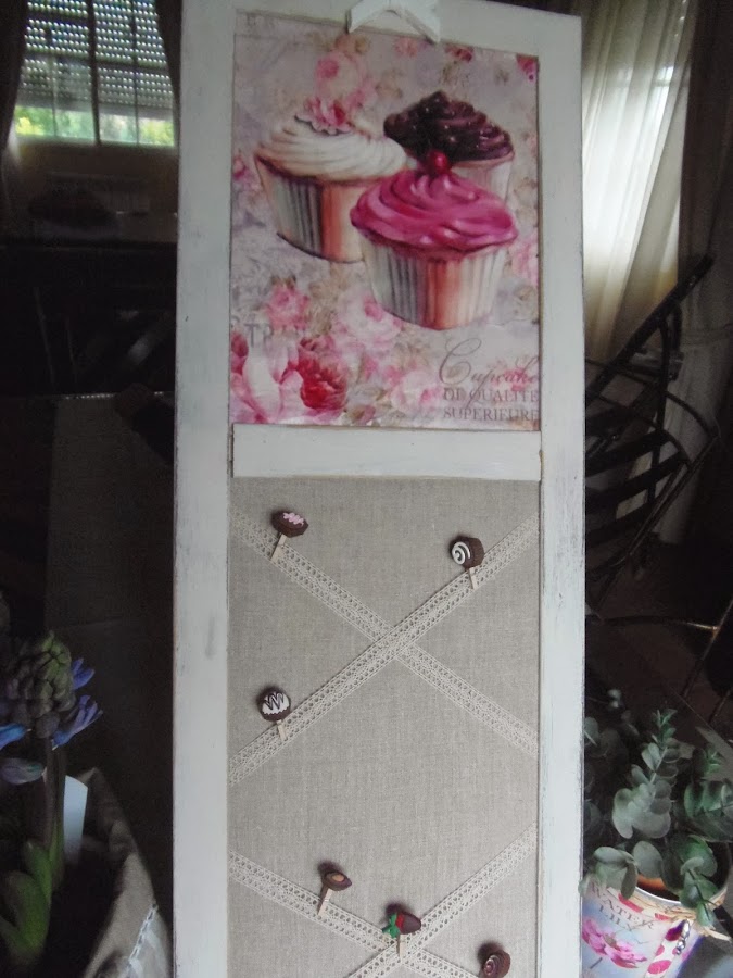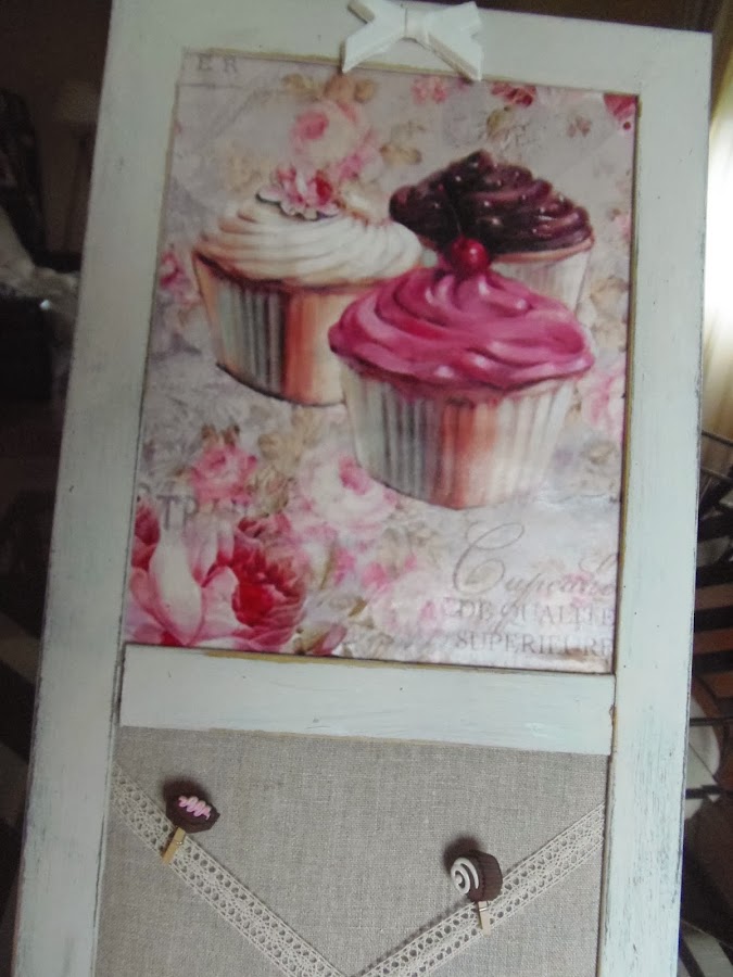 Cómo enamorada de los motivos de cupcakes,tartitas y demás,he hecho esta pizarra con transfer y tela de lino