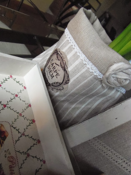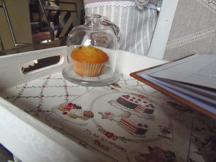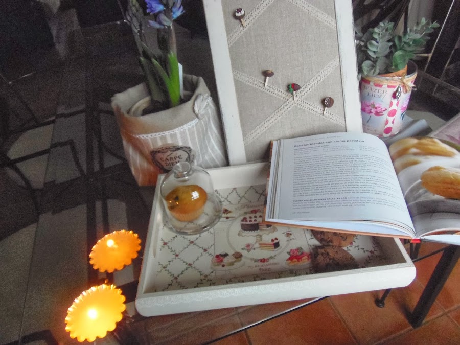 Y una bandeja decorada con una servilleta de aquí,con las hojitas y las rosas pintadas a mano y stencil de puntilla en relieve por el exterior.