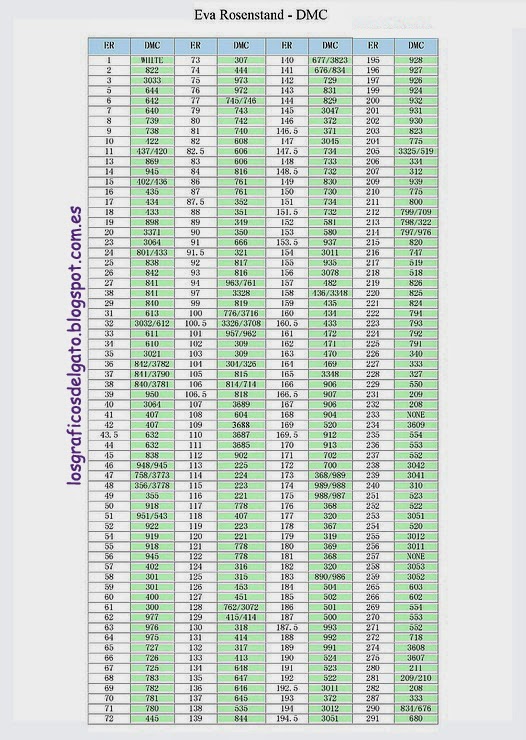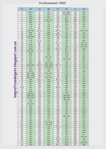 Tabla de conversión de hilos Eva Rosensatand-DMC...