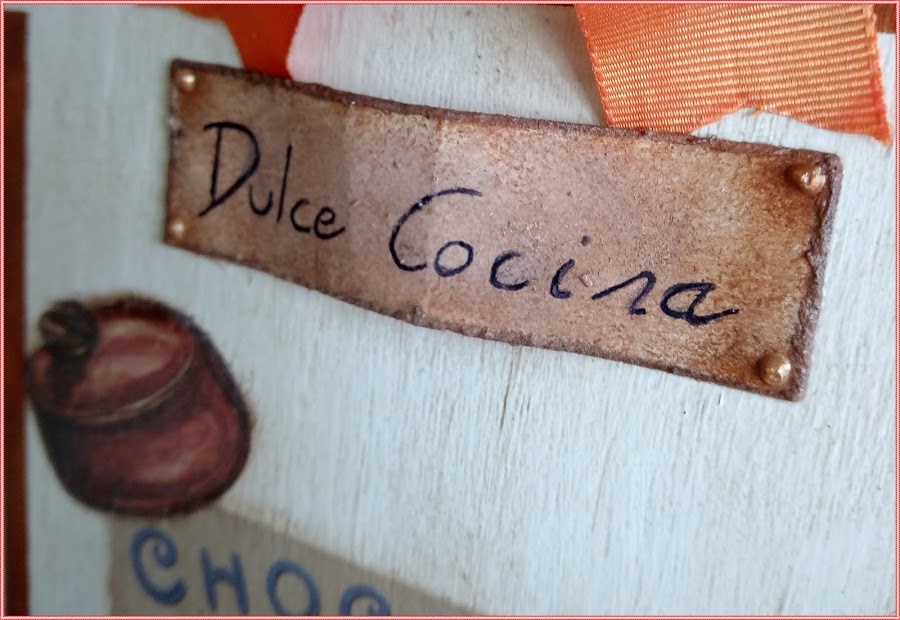 Le apliqué gesso para darle mas resistencia y poder pintarlo mejor, envejecí y escribí "Dulce Cocina".