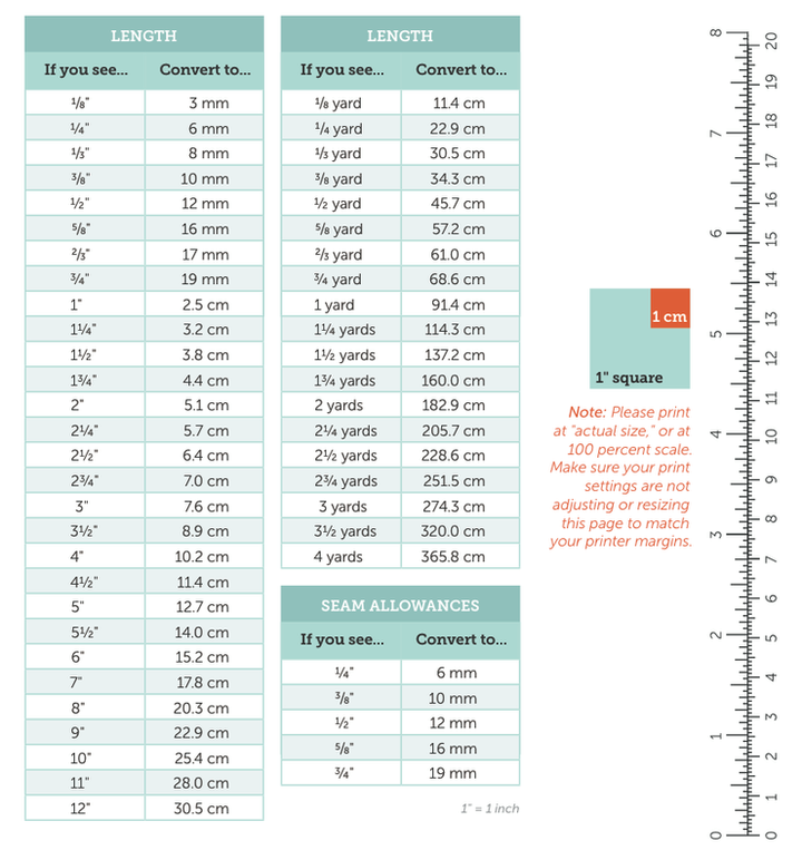 Buscando conversiones de patchwork encontré esta tabla compuesta de yardas, pulgadas y centímetros, muy práctica para nosotras.