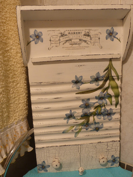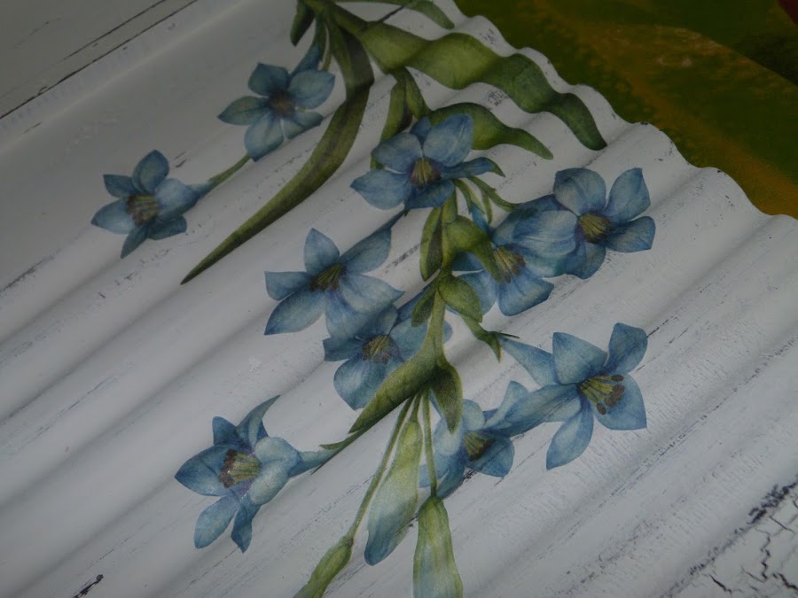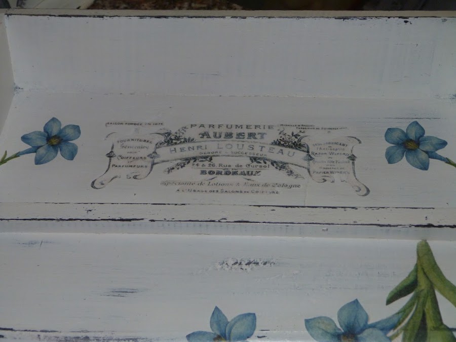 En la parte superior, unas flores sueltas del mismo papel a cada lado, y un cartel también de papel de arroz, que una vez colocado he desgastado mucho, lijándolo e incluso con toques en blanco a pincel seco, para darle un efecto muy, muy desgastado.