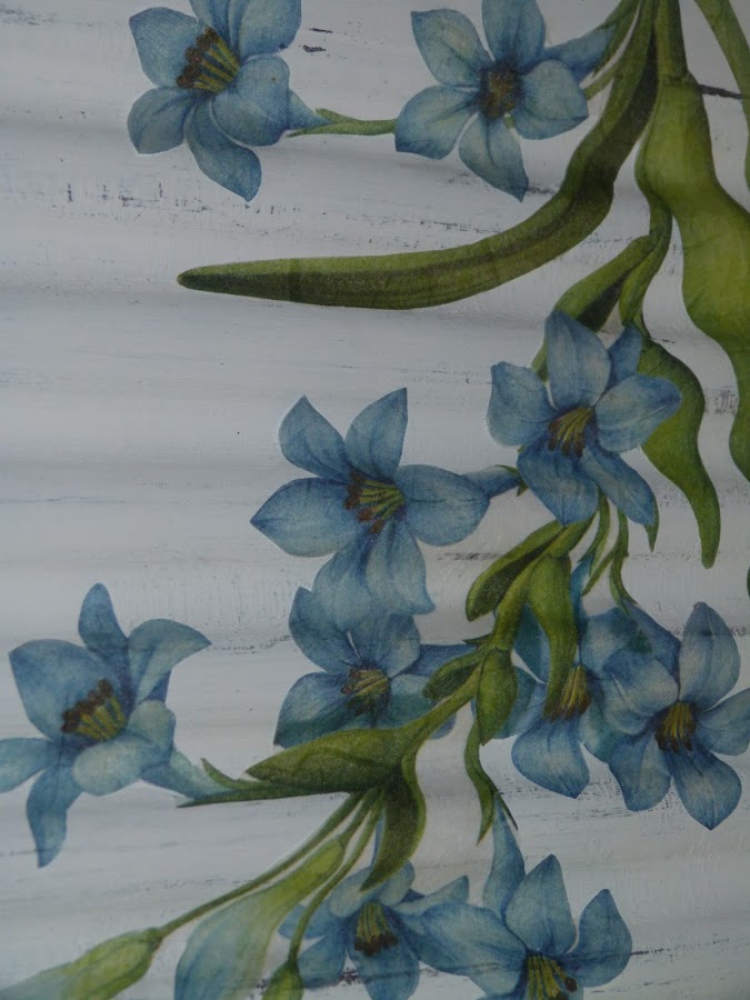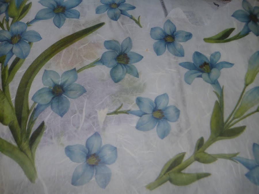 Fijaos si tenía ganas de hacer esta tabla, que hasta tenía el papel comprado desde hacía bastante tiempo. Tampoco fue fácil encontrar un papel de arroz con guirnaldas de flores azules. De guirnaldas de flores hay muchísimos y muy bonitos, pero no azules. Cuando por fin lo encontré no lo dudé un momento y lo compré, así que ahí ha estado guardado esperando a su compañera.