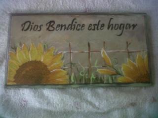 Este es un cuadrito pequeño para colocar en la entrada de la casa o en algún espacio preferido del hogar de la familia, esta hecha en la técnica de decoupage, las flores son de servilletas pero el resto de los detalles las hice con pinceladas en acrílico asi como la tablita debajo de esta.