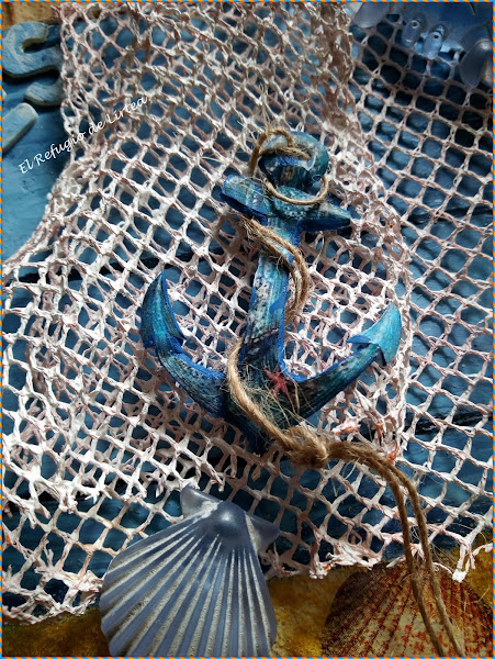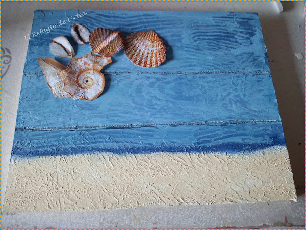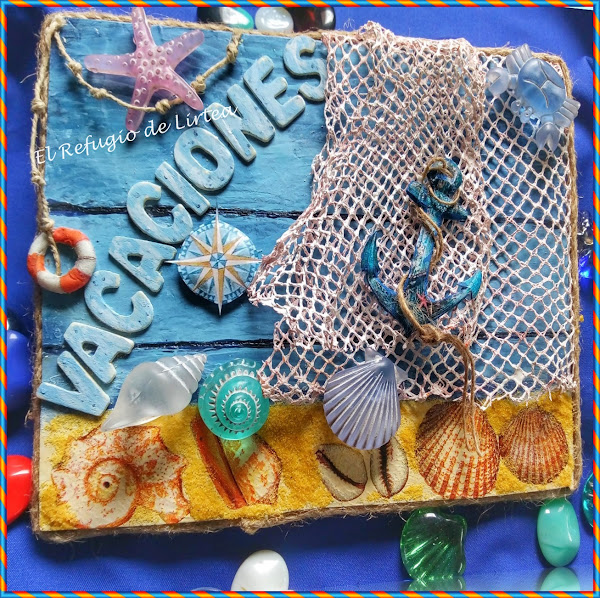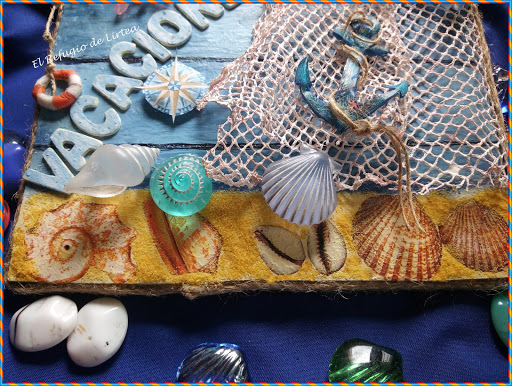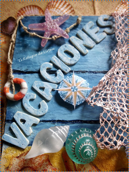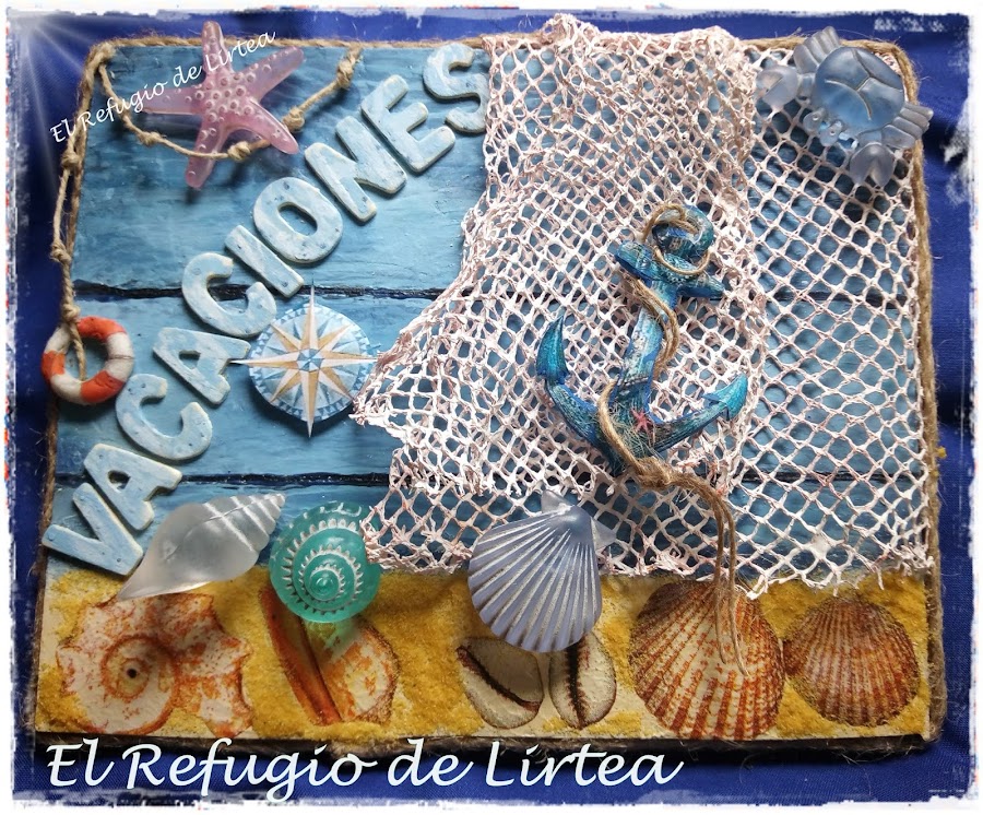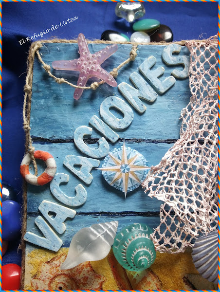 No sé vosotras, pero yo el verano lo asocio con vacaciones, y mirad si lo asocio que en el cartel que he realizado para este reto en lugar de la palabra verano sin darme cuenta he puesto vacaciones, pero cuando me dí cuenta ya estaban pegadas las letras, así que lo he dejado así, pero voy por partes y os cuento como he hecho este pequeño cuadro de temática marinera y por supuesto veraniega.