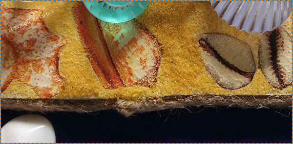 En la parte inferior donde hice el decoupage doy barniz y antes de que este seque espolvoreo arena de color amarilla, intentando imitar la arena de la playa.
