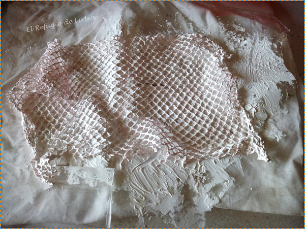 Tomo una bolsa de red, concretamente es una bolsa de red donde vienen las naranjas ( no tenía blanca) y le aplico gesso, así consigo que sea más consistente y además le doy el color blanco, ideal para imitar una red que pego sobre mi tablilla.