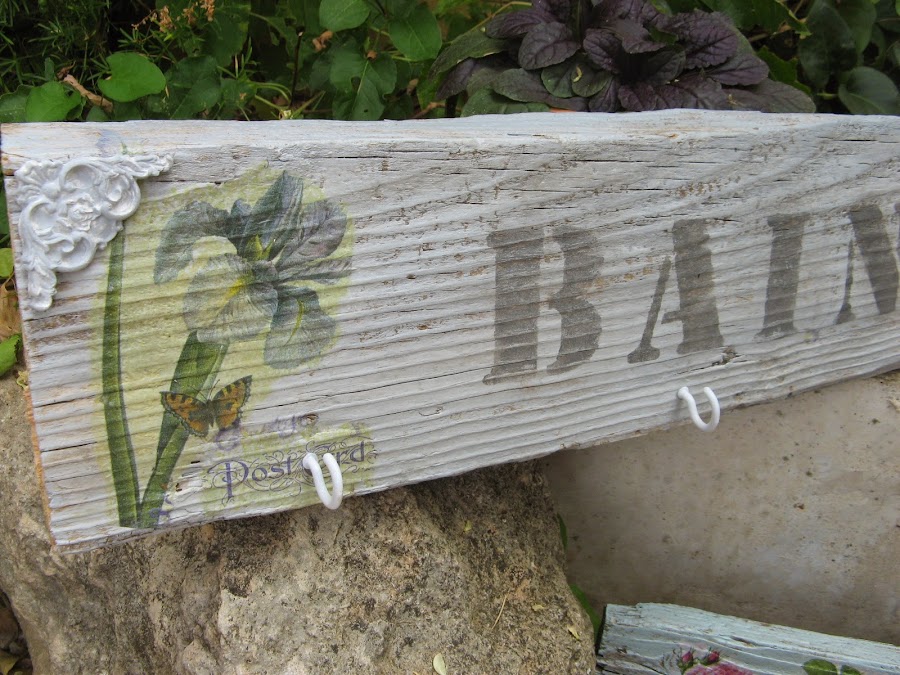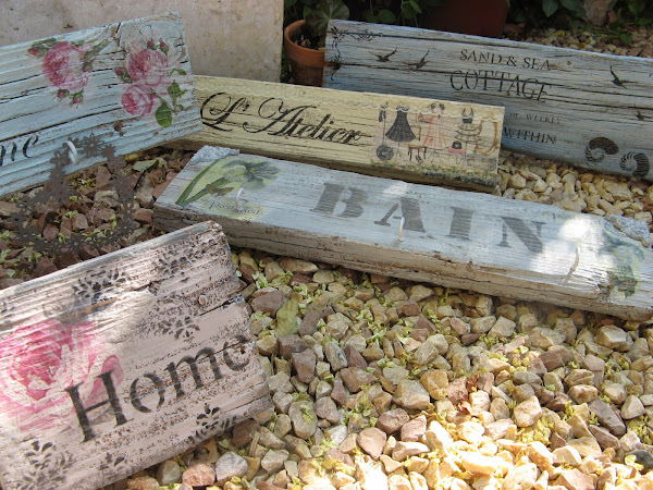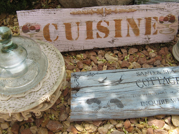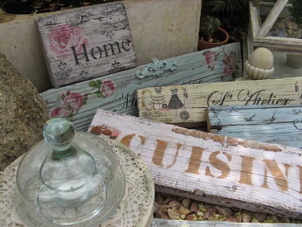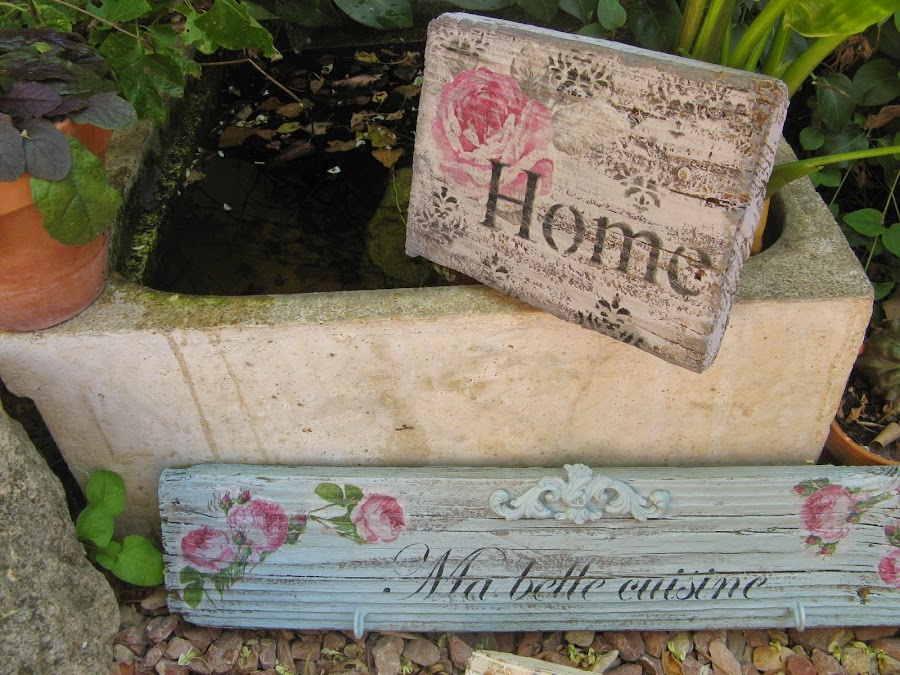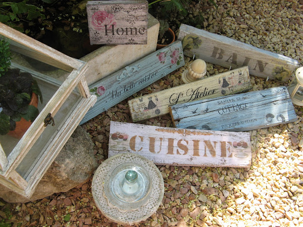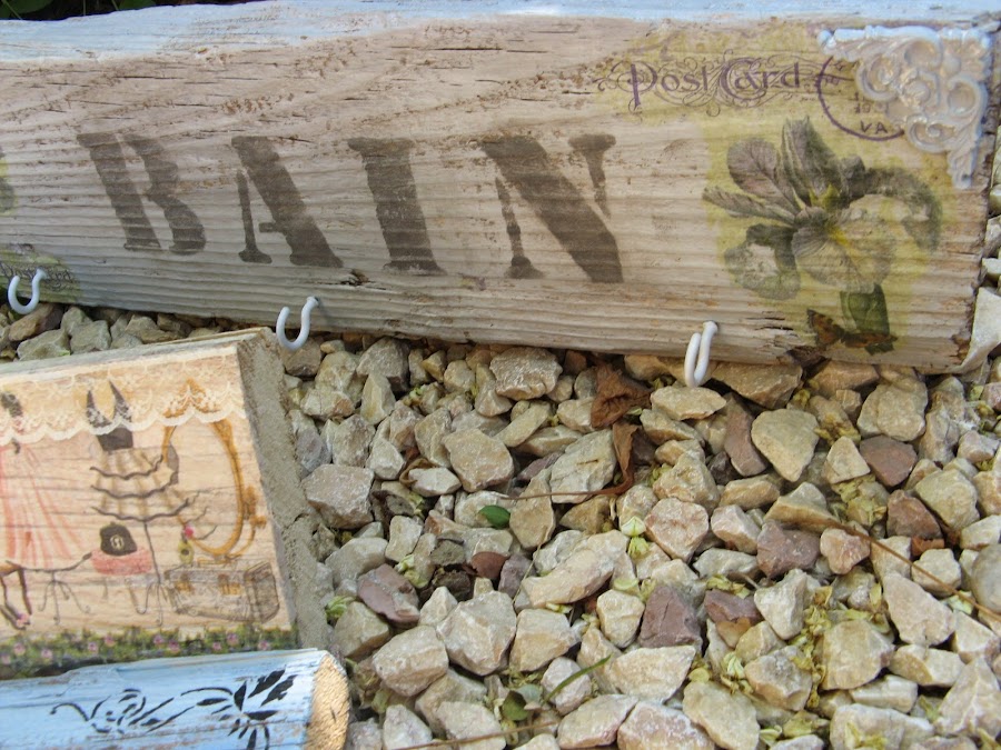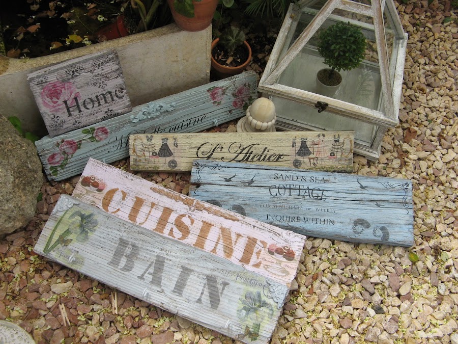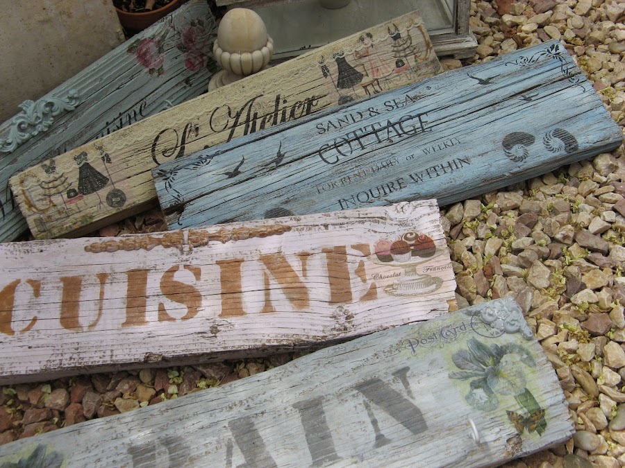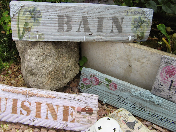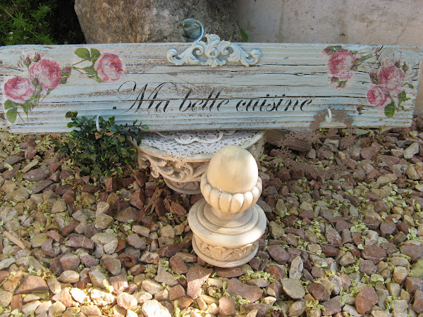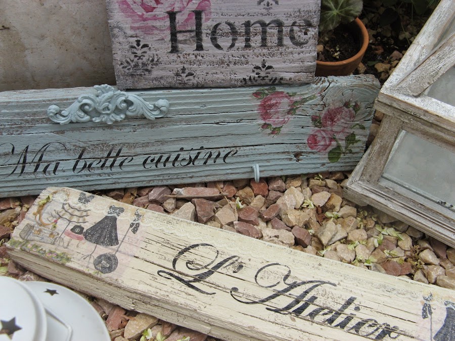 El de "Cuisine" hecho con un abecedario de letra grande....arriba unas tallas de madera pintadas...a los lados recortes de servilleta....todo bien barnizado al final....