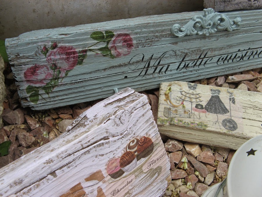 No tengo ni idea de qué madera es, pero el decoupage en ellos queda especialmente integrado....se trasparentan las grietas de la madera añeja....