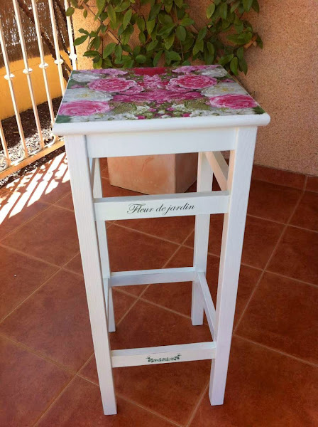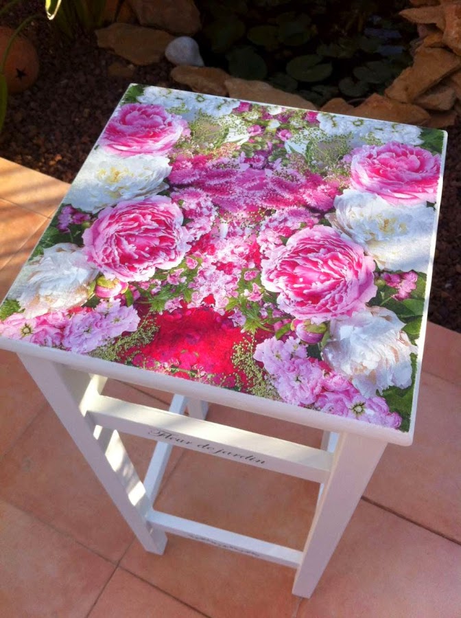 Como contaba con ayuda, no fue difícil cuadrarle la servilleta, que llegó justita justita... La pegué con Mod Podge y la planché con papel vegetal de horno por encima para proteger. El resultado fue fantástico porque la servilleta se quedó sin ninguna arruga, tan adherida al taburete que se notan hasta las vetas de la madera, parece que está impresa...Así que ya sabéis, a los que se os arruguen las servilletas, tomad nota de estos tres truquitos para que no os pase: