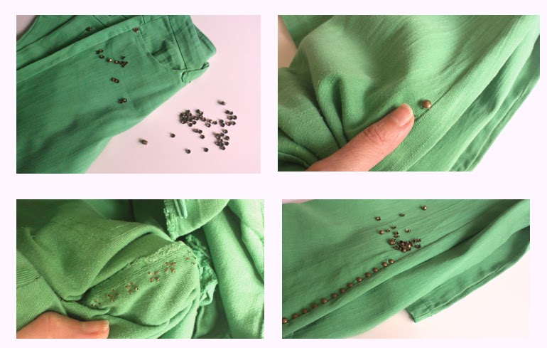 Después de ver muchas ideas, me quedé con unas cuantas. La versión de poner tachuelas en el lateral de los pantalones me encantó, así que me puse a trabajar. Sólo se necesitan un puñado de tachuelas y un pantalón pitillo. En mi caso, elegí unas tachuelas color cobre, que compré en Megino (otro día os hablaré de esta estupenda tienda), y unos pantalones verdes que tenía en el armario y que me parecían un poco sosos. Aunque también creo que quedarían ideales unos pantalones blancos con tachuleas plateadas ¿no os parece?