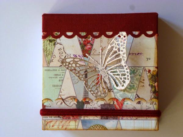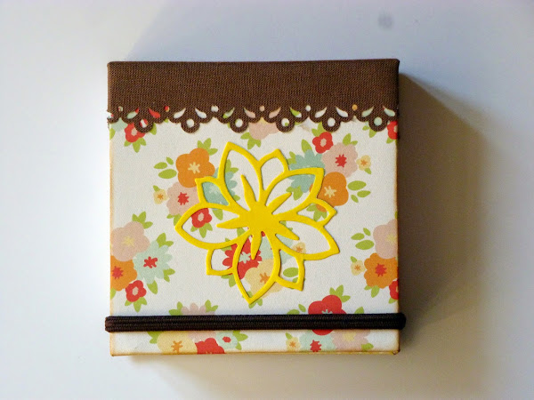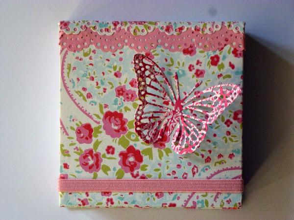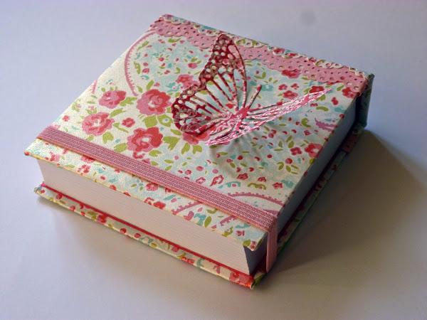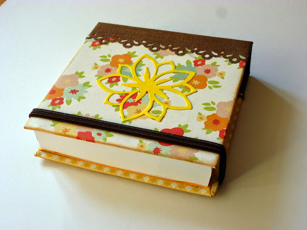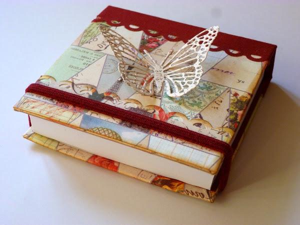 Hice las tapas con cartón debaja densidad, que se corta muy bien con cutter e incluso con una cizalla de palanca. Lo forré con papel de scrap, y el lomo está reforzado con tela de encuadernar que se troquela perfectamente con troqueladoras de bordes. Para cerrar, hice agujeros en la contraportada con la Crop a Dile y con eyelettes sujeté goma a tono con los papeles.