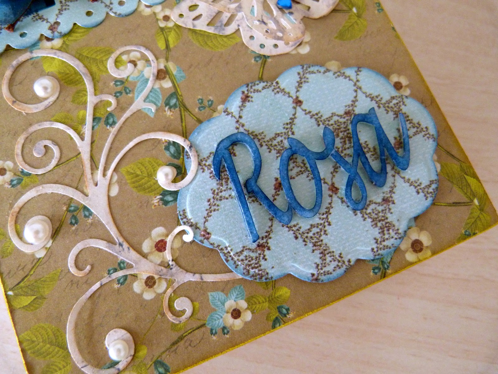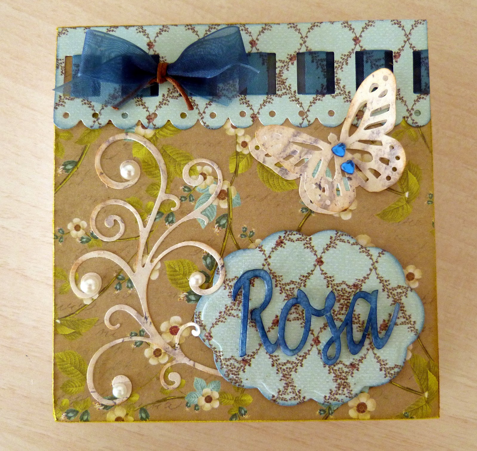 Una vez más los papeles son de Prima pero de la colección Madeline. El troquel pasacintas es de Woodware, arabesco de Die-namics, mariposa de Martha y el nombre también cortado con la Craft sobre el mismo troquel que el anterior taco.