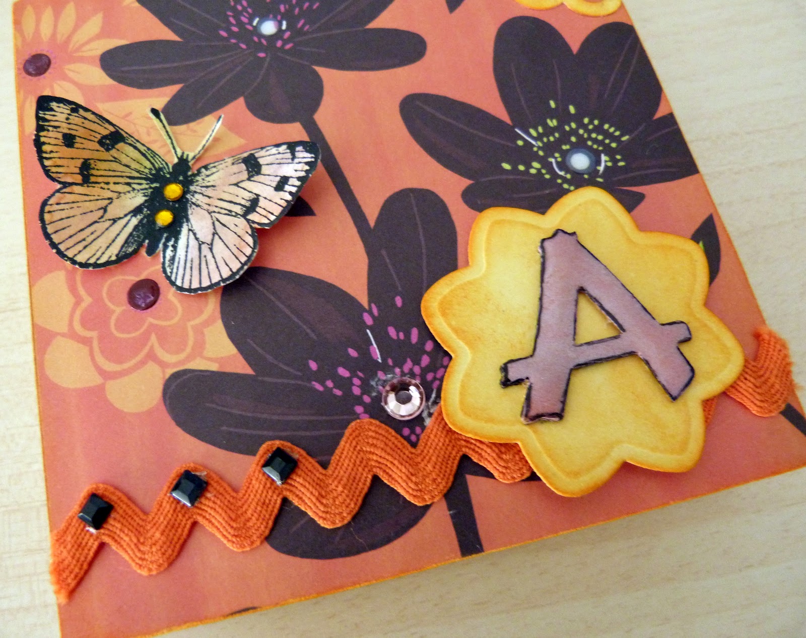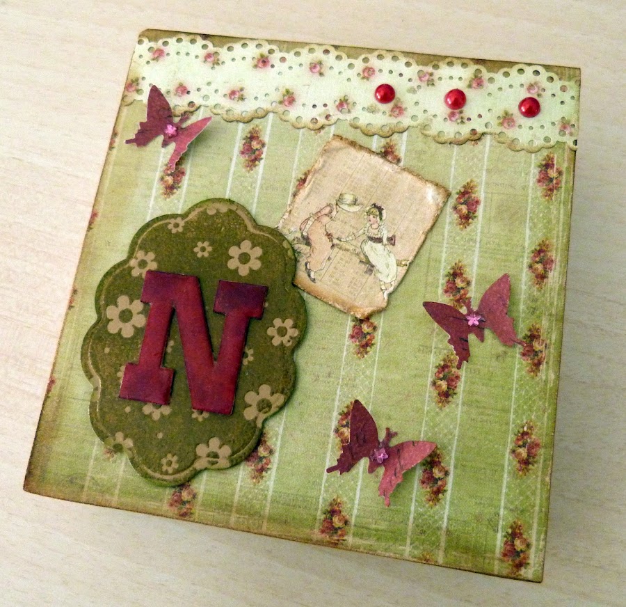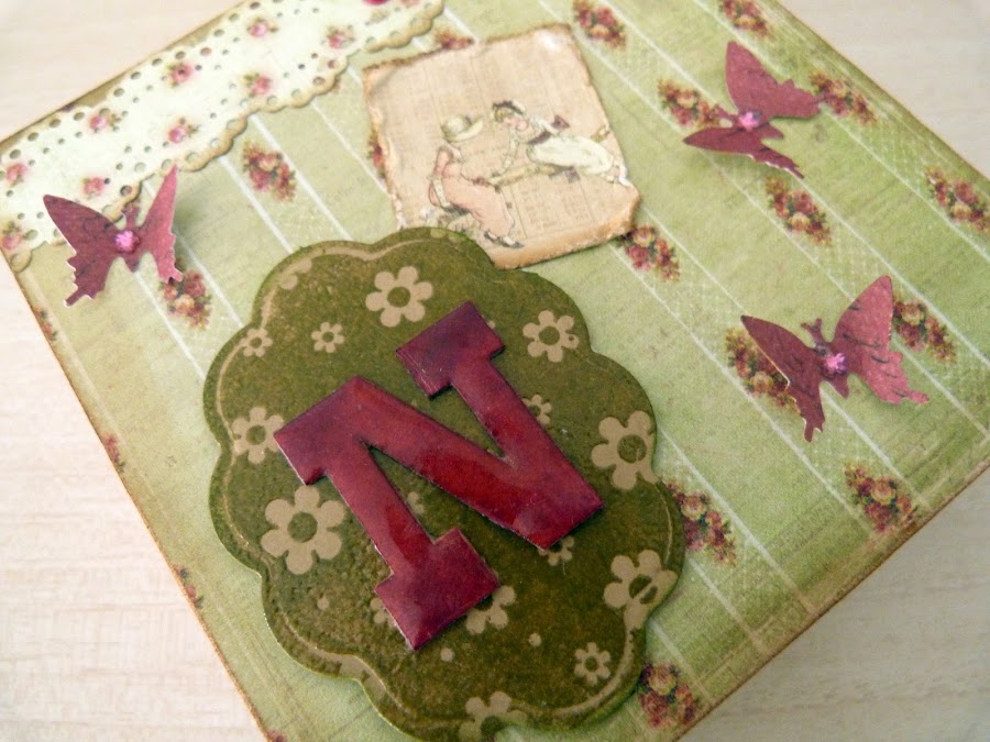 Esta vez el papel es de Prima, de la colección Romantique, entintado con Peeled Paint, troquel también de Martha, maripositas de Fiskars y la inicial hecha como la anterior sobre el troquel Spellbinders Scalloped Ovals.