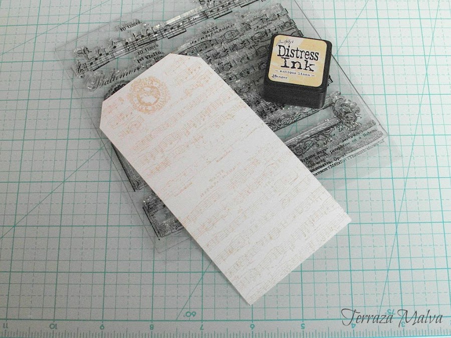 Como fondo para el tag he utilizado el sello "Music Notes" de Heidi Swapp y tinta Distress "Antique Linen".