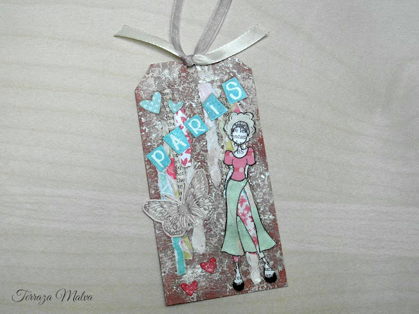 Con papeles de la misma colección he recortado las distintas piezas de la muñequita. Las letras de la palabra "Paris" son de un alfabeto de Habico. Las he estampado con tinta chalk y las he recortado también, siguiendo la filosofía del tag de cortar y cortar papel....He completado el tag con una mariposa estampada, unos corazones de Lawn Fawn troquelados y cintas de raso. Ya espero con impaciencia el tag del próximo sábado!!!