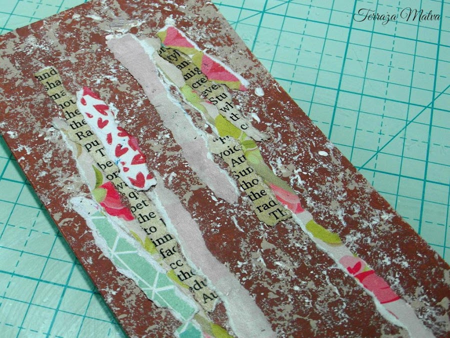 El resultado me encanta y es perfecto para técnicas mix-media. Después he rasgado unos cuantos papeles de la colección "Crush" de WRMK y papel de periódico para añadir a la base.