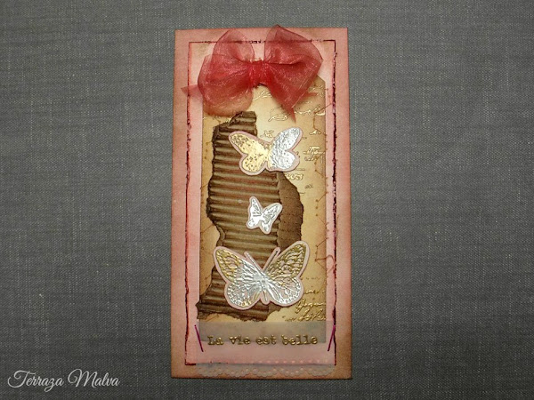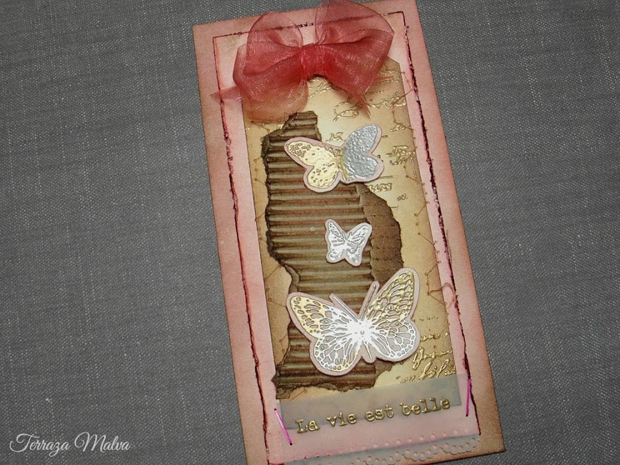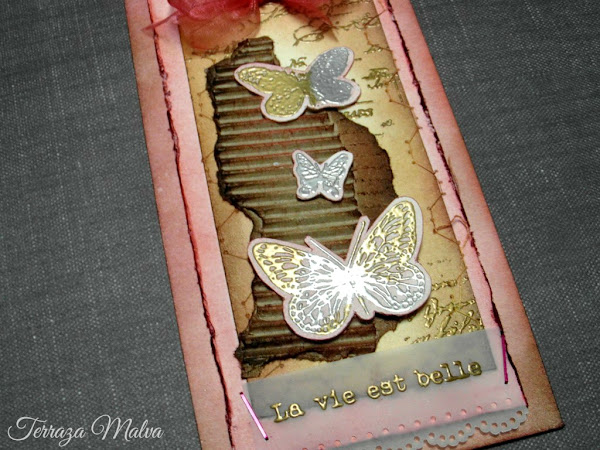 Esta es otra tarjeta tipo shaker que he mandado este año.... (si, me gustan las shaker, que le voy a hacer....) El marco está troquelado en papel purpurina plateado, del mismo tono que los cordones ...