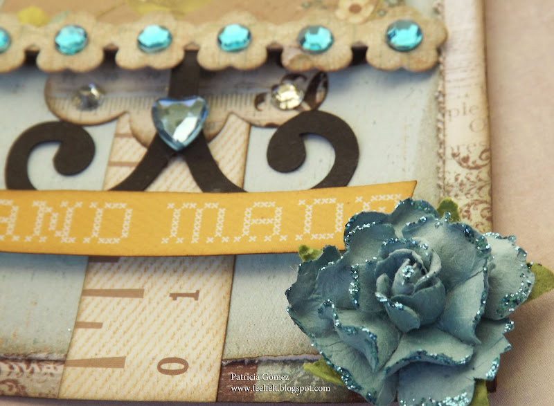 El texto Hand Made y la cinta métrica perpendicular son recortes de un papel de My Little Shoebox. La flor es de Prima, y lleva toques de stickles turquoise.