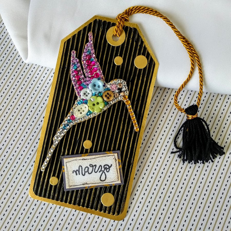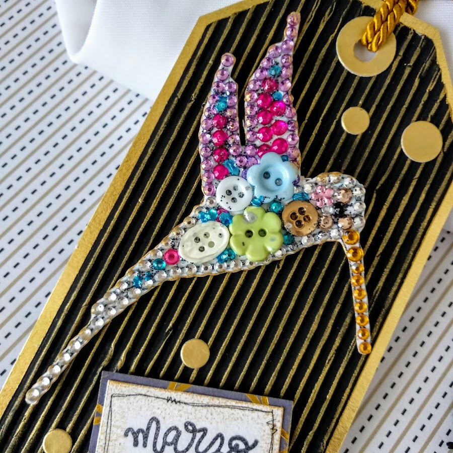 Dibujé sobre cartulina blanca un colibrí y lo fui rellenando con brillantitos y botones, lo recorte y pegué sobre la base con un poco de foami adhesivo para que quedara en relieve.