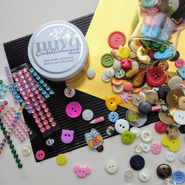 Fui por mi botella de botones, cartulina negra ondulada, otra dorada y brillantitos adhesivos, ahhhh!!! y un poco de Nuvo embellishement en mousse, con todo esto me puse manos a la obra para hacer un tag que tiene a Adrián como destinatario.