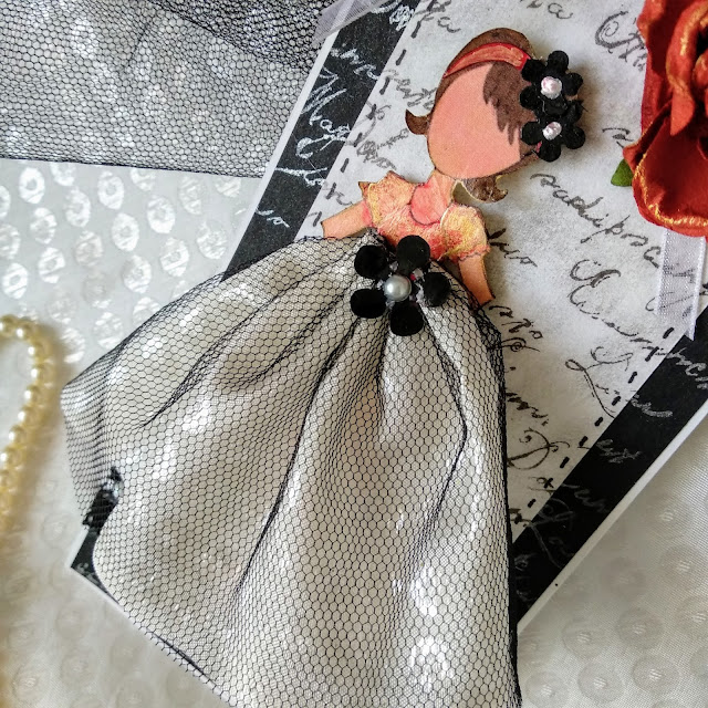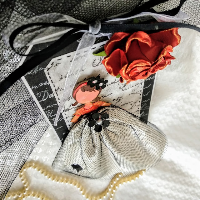 La base son varias cartulinas y un fondo hecho con un sello de escritura y polvos Perfect Pearl.