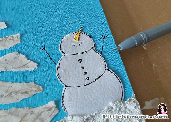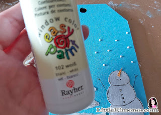 4. Pegamos sobre el tag y dibujamos los contornos y los brazos con forma de ramitas usando un rotulador de punta muy fina. Para hacer el efecto nieve he usado "window color" en blanco que se usa para hacer dibujos sobre cristal pero ha quedado genial para hacer los copos de nieve sobre la madera ya que tiene efecto relieve ;)