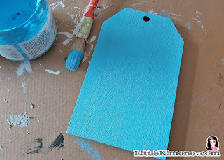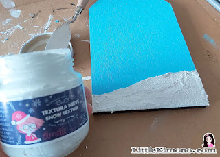 1. Primero vamos a pintar el tag con pintura a la tiza, en esta ocasión lo he hecho en un tono azul cielo. Una vez seca la pintura damos en la parte inferior una capa de pasta textura nieve de Amelie para simular una montaña de nieve.