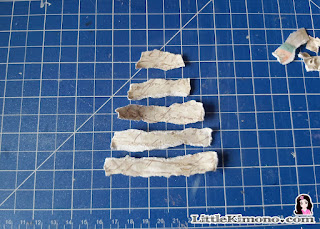 2. Con un hoja de papel periódico, papel de scrap (como he hecho yo^^) o una hoja con texto impresa... rasgamos unas 5 tiras (dependiendo del tamaño del proyecto que tengamos haremos más o menos tiras) podemos cortarlas todas iguales y luego ir cortándolas a medida para que quede la forma del árbol de navidad y pegamos sobre el tag.