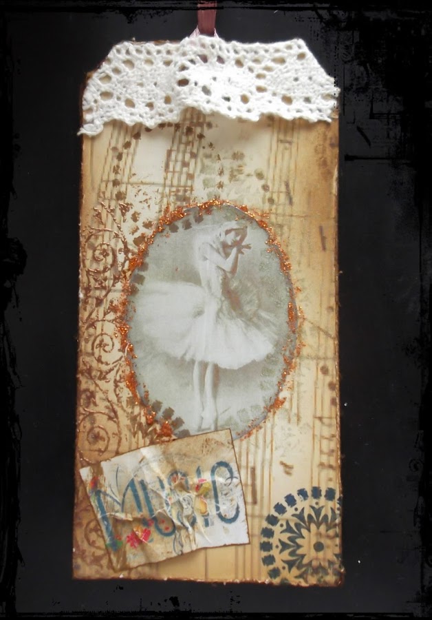 Aquí podéis ver los bordes del papel arañado Imprimí una imagen de una bailarina, que recorte de forma ovalada y pegue en el centro de la etiqueta y rodee de pegamento con purpurina.