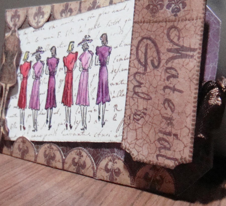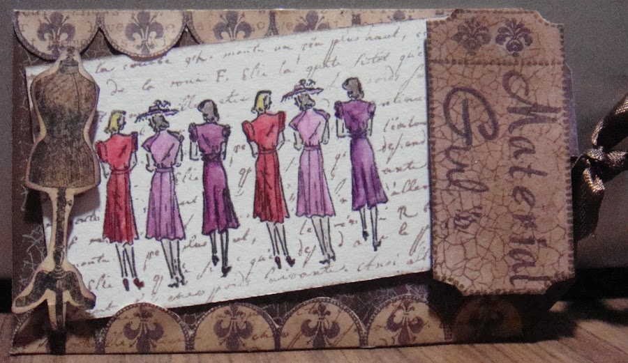 Hola! quería compartir el nuevo tag llamado Material girl"s y dejarles el tutorial de como emplee en él la técnica de masking. Los materiales que utilice en su elaboración fueron: tintas versafine color vintage sepia, imperial purple, tinta versacolor color blanco, distress ink color walnut stain, sellos de textura craquelado, sellos de la marca crafty secrets (imagen en la entrada anterior) sew special , artsy banners y adore alphabet y el tag esta hecho con un sello de la marca Kaisercraft. El maniquí es de un papel Graphic 45 de la colección Steampunk debutante.