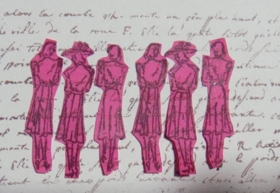 Para la imágen central utilice papel acuarelable en el cual estampe las figuras de las señoras con tinta versafine negra y las pinte con lápices acuarelables y para hacer el fondo utilice la técnica de masking:
