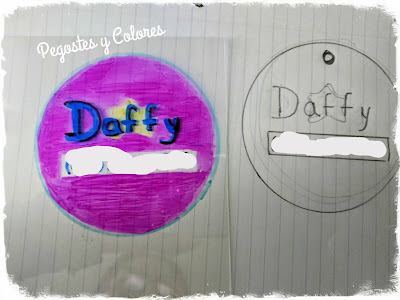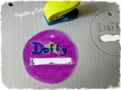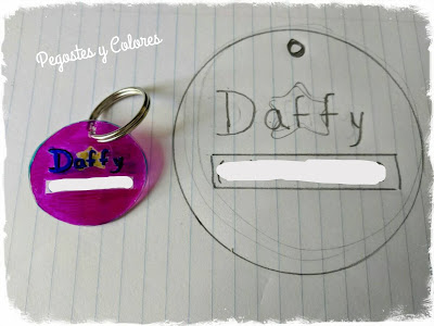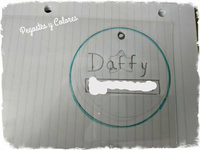 1.- Dibuje un circulo en una hoja de papel de 9 cm de diametro y dentro escribi "Daffy" el nombre de mi perrita y un rectangulo para escribir el numero de telefono o celular.