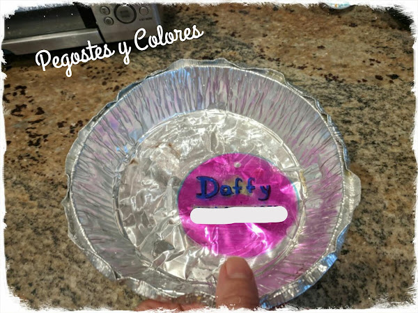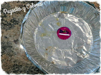 4.- Precalienta el horno a 163 °C (325 °F). Protejer una charola de hornear con papel aluminio y colocar tus diseños de plastico sobre ella. O usar una charola de aluminio vieja, como esta que guardo y reutilizo todo el tiempo para trabajos de este tipo.